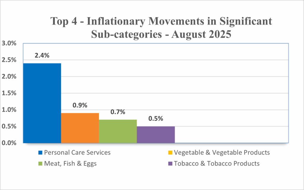 Significant sub-categories contributing to the rise in the Food category include Vegetable & Vegetable Products (0.9%), Meat, Fish & Eggs (0.7%), Tobacco & Tobacco Products (0.5%), Oil & Fats (excluding Butter) (0.3%), Non – Alcoholic Beverages (0.2%) and Sugar, Honey & Related Products (0.1%).