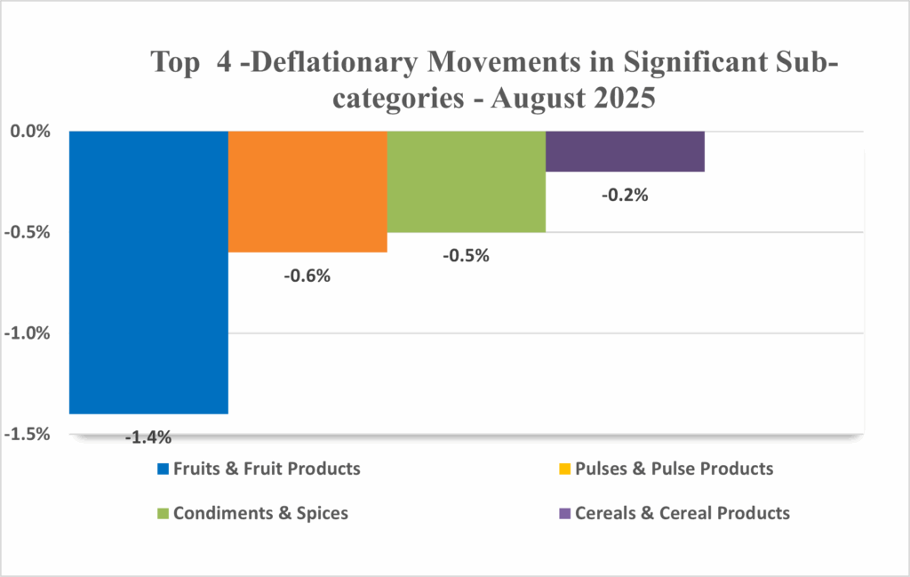 - Food subcategories: Fruits & Fruit Products (-1.4%), Pulses & Pulse Products (-0.6%), Condiments & Spices (-0.5%), Cereals & Cereals Products (-0.2%), Milk & Milk Products (-0.1%) and Alcoholic Beverages & Intoxicants (-0.1%).