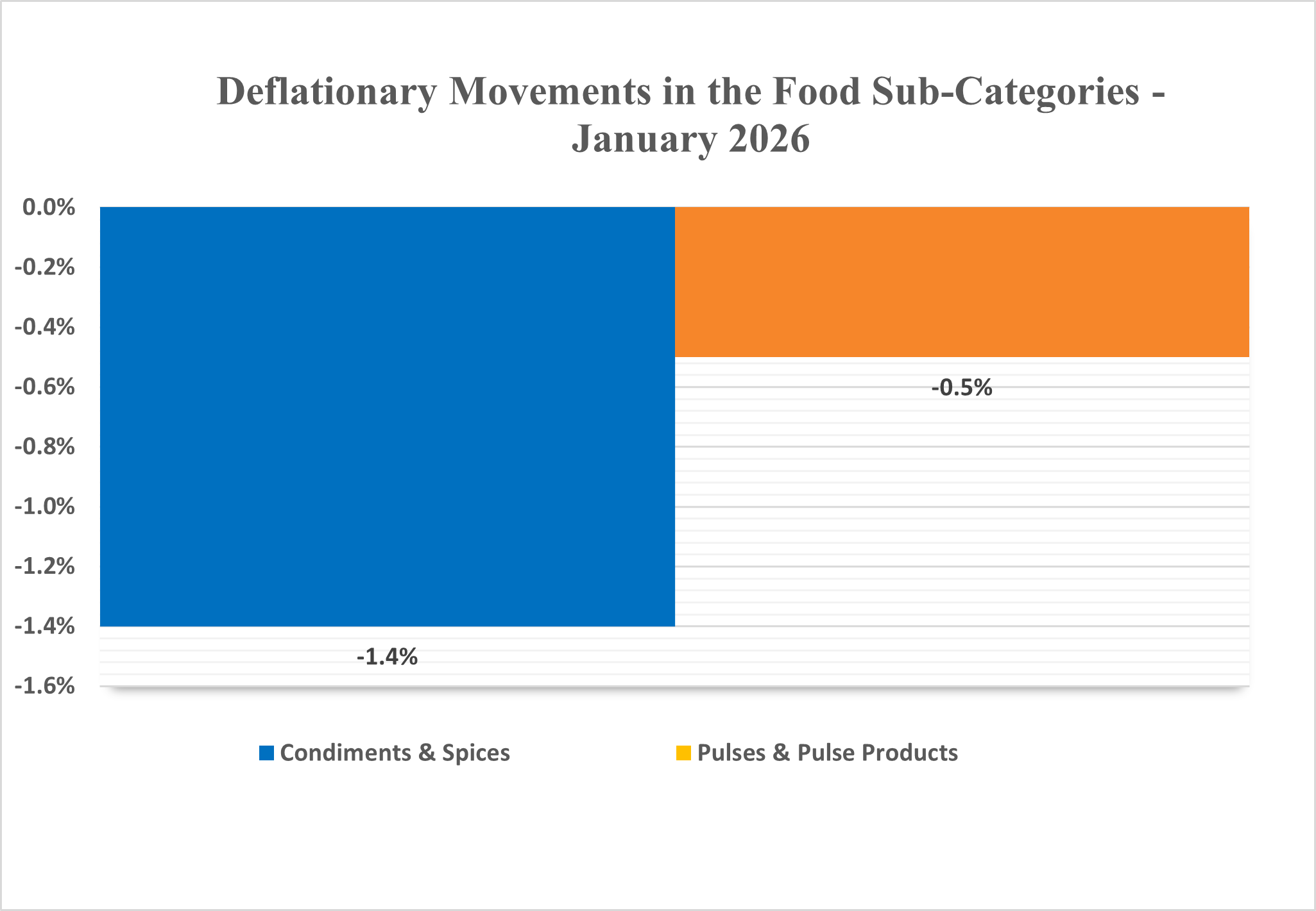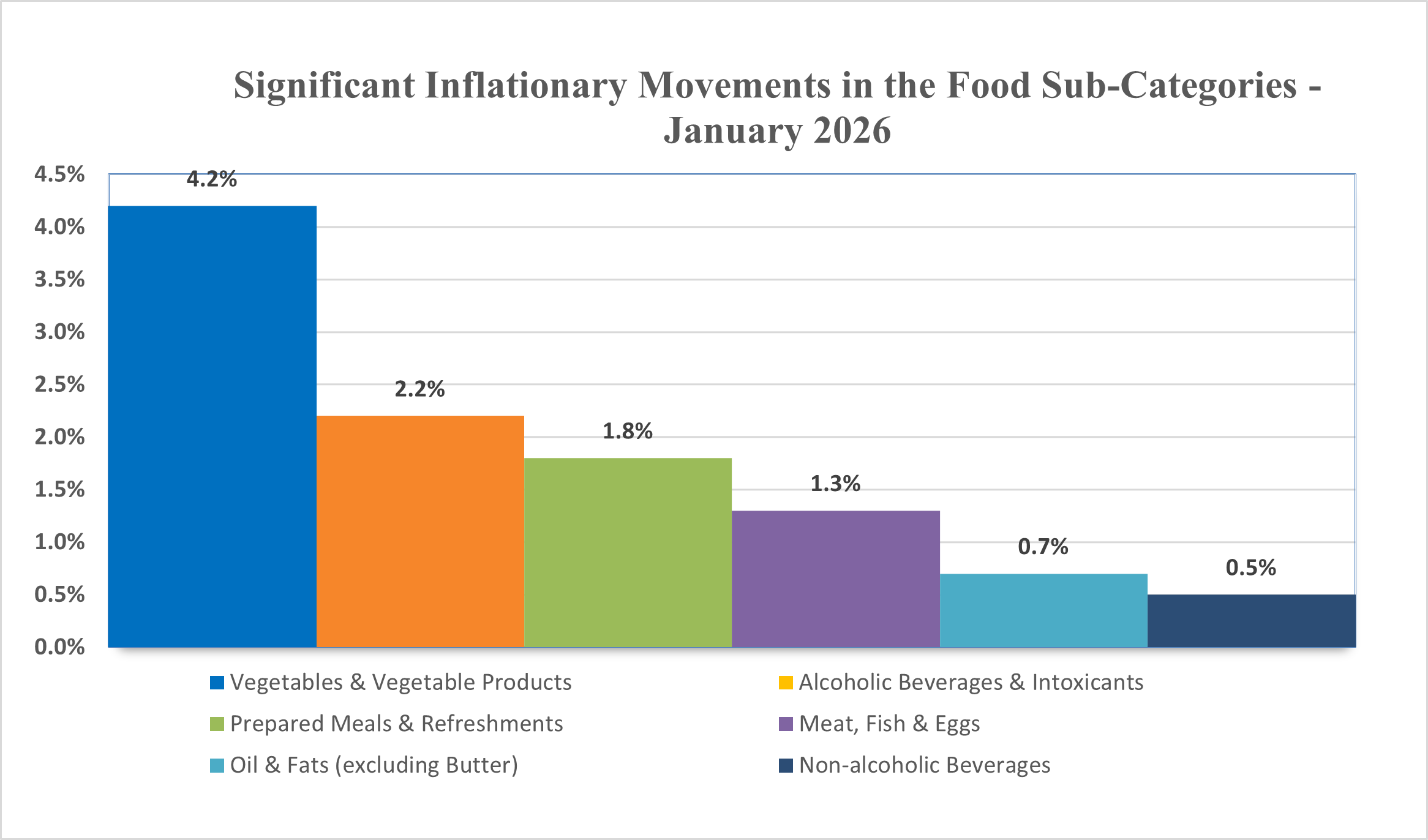 The primary contributor to the monthly inflation is the Food (1.3%) category. Significant sub-categories contributing to the rise in the Food category include Vegetables & Vegetable Products (4.2%), Alcoholic Beverages & Intoxicants (2.2%), Prepared Meals & Refreshments (1.8%), Meat, Fish & Eggs (1.3%), Oil & Fats (excluding Butter) (0.7%), Non-alcoholic Beverages (0.5%), Sugar, Honey & Related Products (0.3%), Fruits & Fruit Products (0.2%) and Cereals & Cereal Products (0.1%). The inflationary trend in this category was offset by the following sub-categories: Condiments & Spices (-1.4%) and Pulses & Pulse Products (-1.0%).
